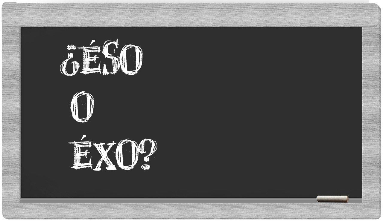 En la situación particular que involucra los términos éso y éxo, nunca deberías vacilar, dado que únicamente éso se encuentra debidamente redactada. Por otro lado, cabe señalar que éxo no figura en el Diccionario de la Real Academia Española.
