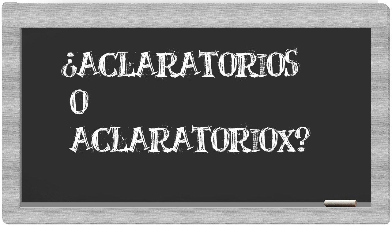 En lo que respecta a la comparación entre aclaratorios y aclaratoriox, nunca deberías experimentar incertidumbre, porque únicamente aclaratorios es la forma correcta de escribirlo. Por otra parte, aclaratoriox no tiene cabida en el Diccionario de la Real Academia Española.