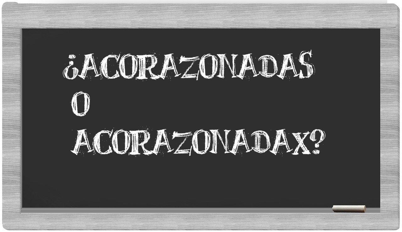 Cuando se presenta la situación entre los términos acorazonadas y acorazonadax, es crucial que no vaciles, puesto que únicamente acorazonadas se encuentra correctamente redactado. En cambio, acorazonadax no se encuentra en el léxico del Diccionario de la Real Academia Española.