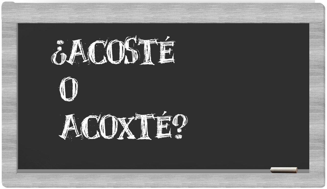 Cuando se confrontan los términos acosté y acoxté, es fundamental no titubear, puesto que solo acosté es la opción adecuada y correcta; por otro lado, acoxté carece de presencia en el Diccionario de la Real Academia Española.