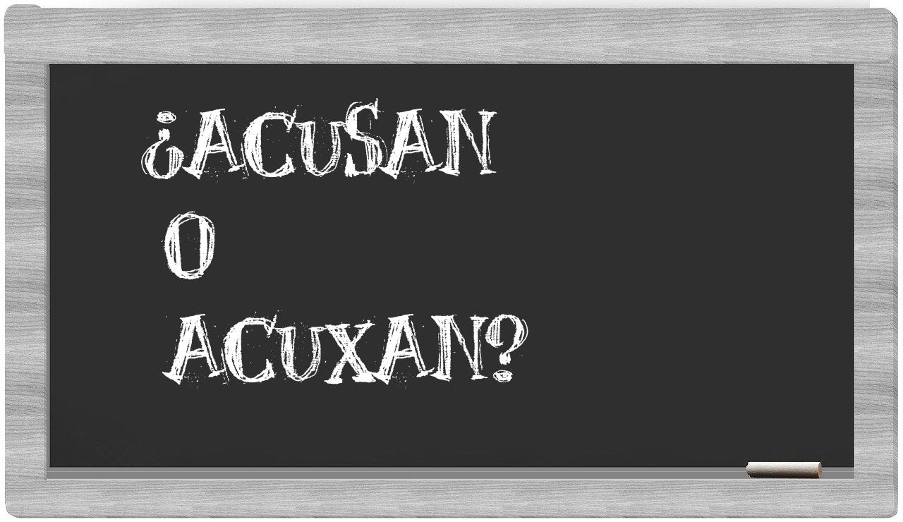 En la situación particular que involucra los términos acusan y acuxan, no deberías titubear, puesto que únicamente acusan es la forma adecuada. Por otro lado, acuxan carece de reconocimiento en el Diccionario de la Real Academia Española.