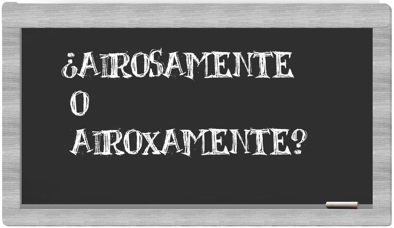 Cuando se presenta la disyuntiva entre airosamente y airoxamente, es fundamental que no vaciles, puesto que solo airosamente se encuentra debidamente consignada como adecuada. En cambio, airoxamente no se halla en el venerado Diccionario de la Real Academia Española.