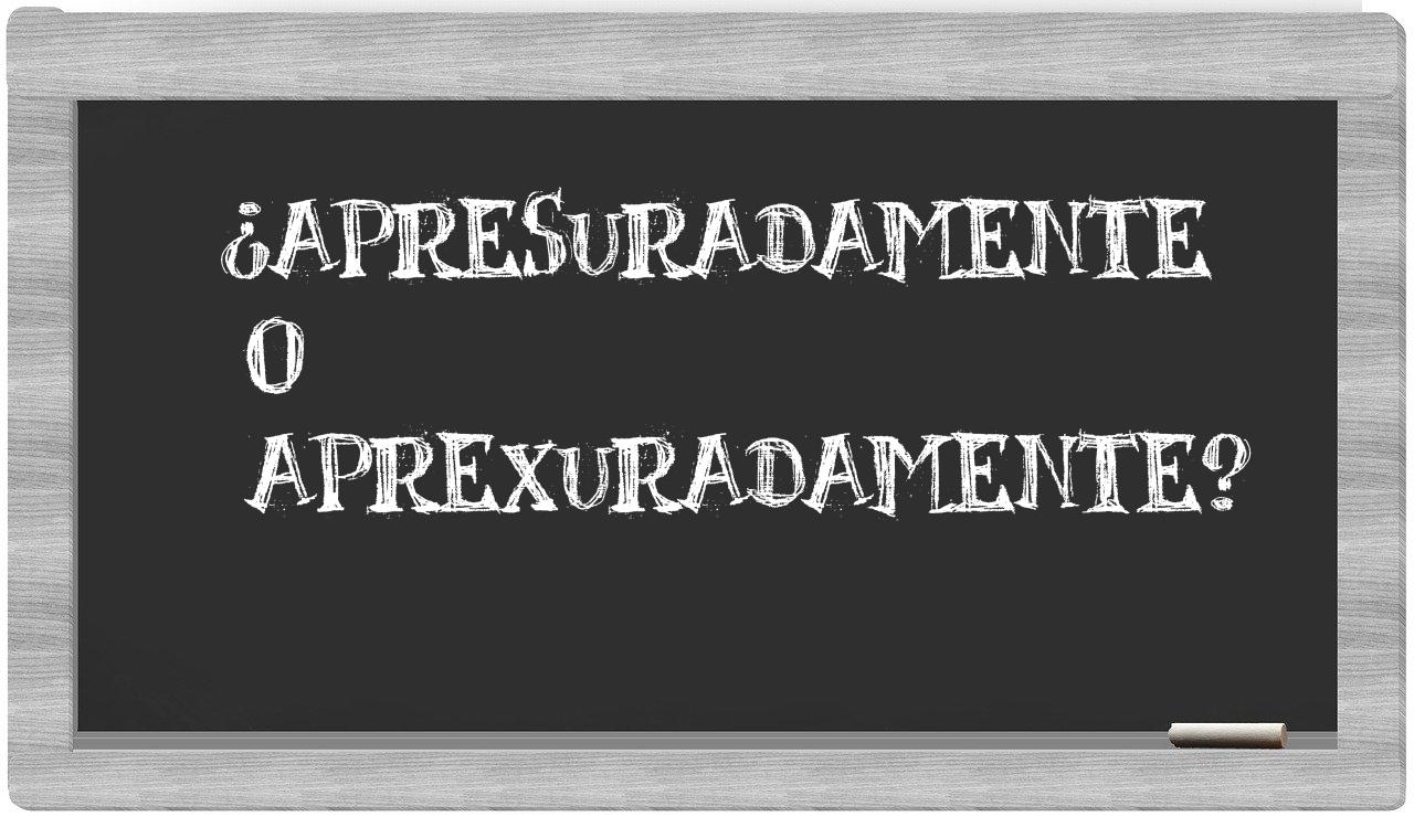 Cuando te encuentres ante la elección de usar apresuradamente o aprexuradamente, es fundamental que no vaciles, puesto que únicamente apresuradamente es la opción adecuada. Cabe resaltar que aprexuradamente no figura en el Diccionario de la Real Academia Española.