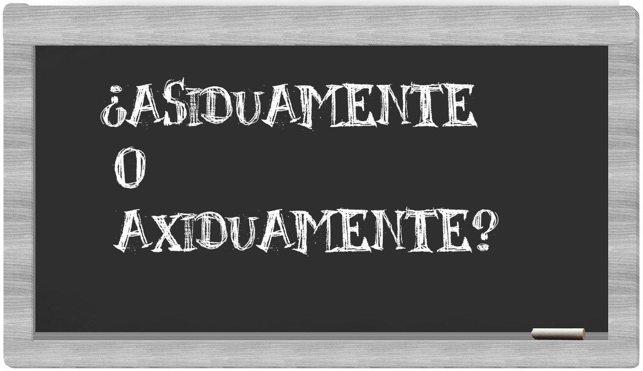 Cuando se trata de las palabras asiduamente y axiduamente, no hay lugar para la incertidumbre, puesto que solo asiduamente se presenta como la opción correcta; de hecho, axiduamente no figura en el prestigioso Diccionario de la Real Academia de la Lengua.
