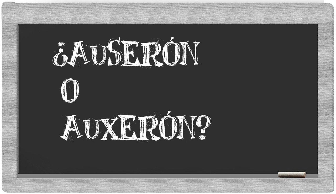 En la situación particular en la que se encuentran los términos auserón y auxerón, no debes titubear, dado que únicamente auserón se encuentra correctamente redactada; auxerón, por el contrario, no figura en el Diccionario de la Real Academia Española.