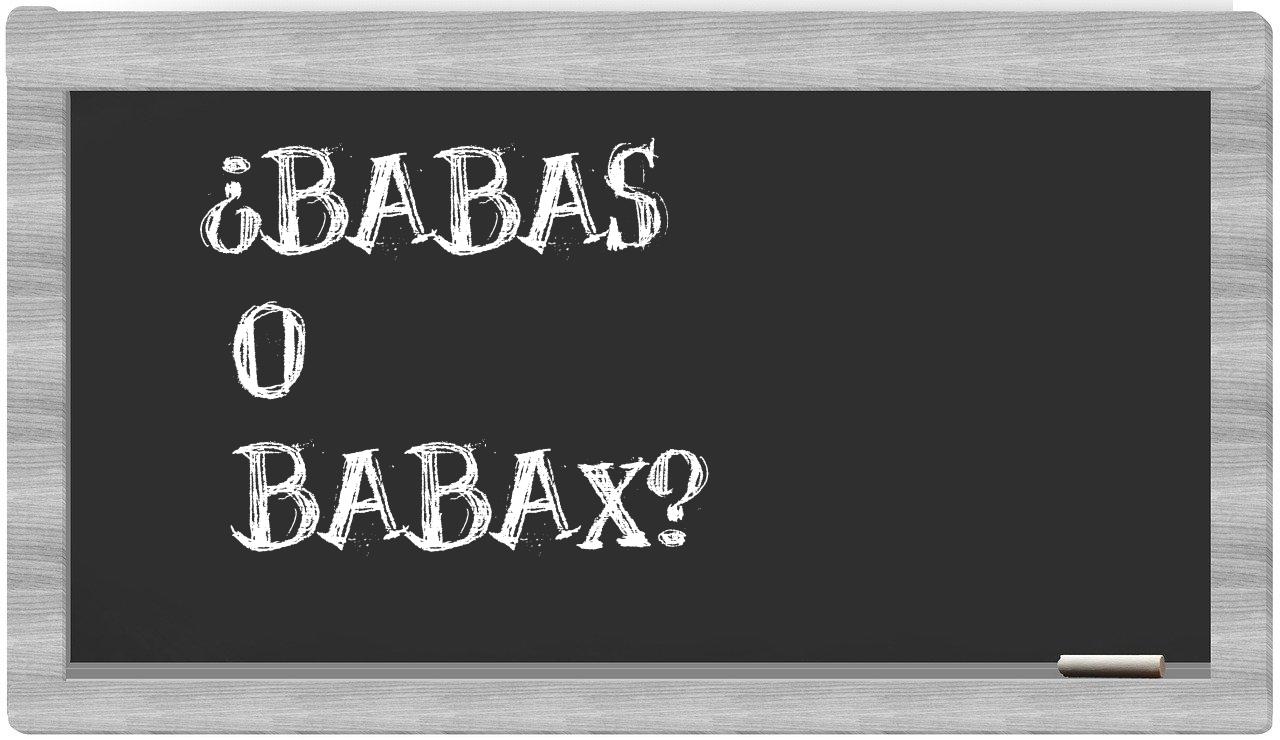 En la situación particular que enfrenta el término babas frente a babax, no deberías titubear en ningún momento, dado que únicamente babas se presenta correctamente. Cabe mencionar que babax no figura en el Diccionario de la Real Academia Española.