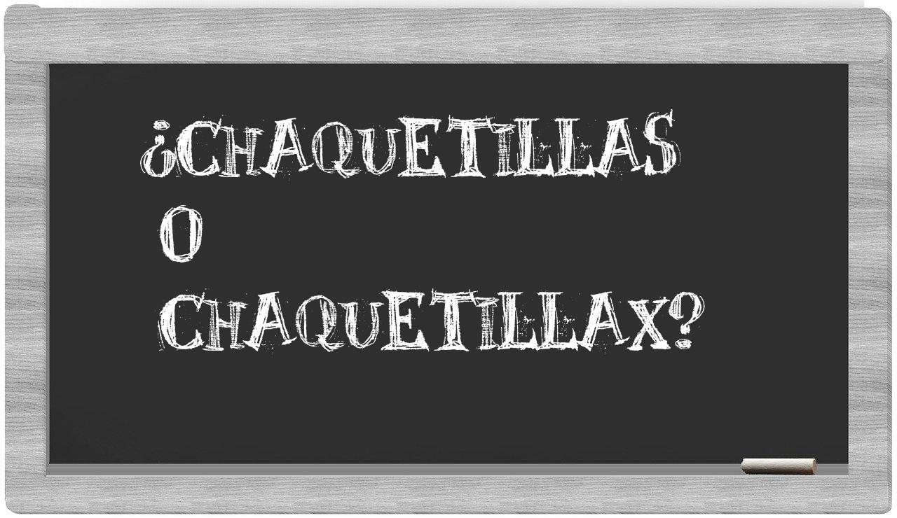 Cuando se trata de elegir entre chaquetillas y chaquetillax, es vital que no te lleves a confusión, puesto que solo chaquetillas es la forma adecuada, mientras que chaquetillax no se encuentra en el venerado Diccionario de la Real Academia Española.