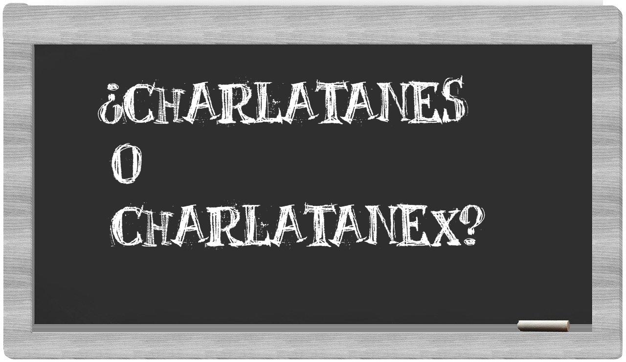 En la situación particular que enfrenta el término charlatanes frente a charlatanex, no deberías titubear en ningún momento, dado que únicamente charlatanes se presenta correctamente. Cabe mencionar que charlatanex no figura en el Diccionario de la Real Academia Española.