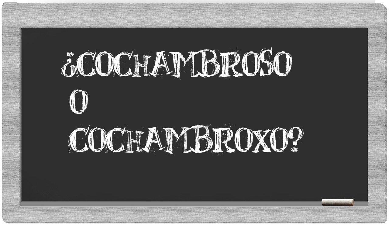 Cuando se trata de distinguir entre cochambroso y cochambroxo, no deberías titubear en tu elección, puesto que únicamente cochambroso es la forma correcta y aceptada; de hecho, cochambroxo no se encuentra en el repertorio del Diccionario de la Real Academia Española.