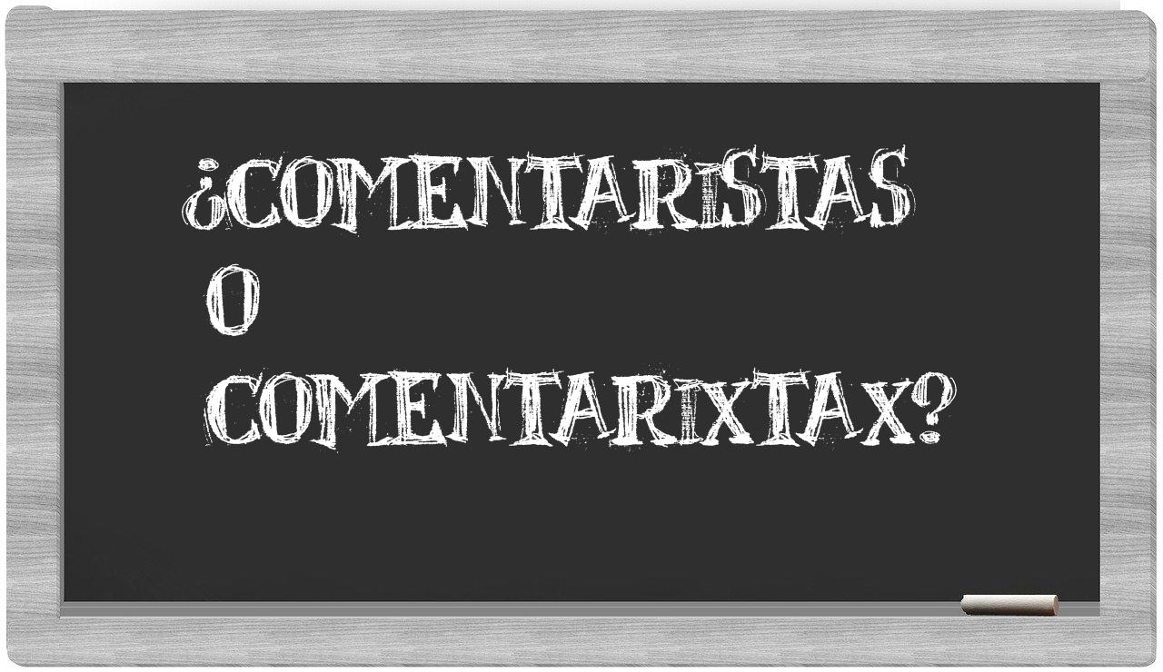 Cuando te enfrentes a la elección entre comentaristas y comentarixtax, no permitas que la incertidumbre te invada, pues únicamente comentaristas es la opción que cuenta con la validación adecuada; de hecho, comentarixtax ni siquiera se encuentra registrada en el prestigioso Diccionario de la Real Academia Española.