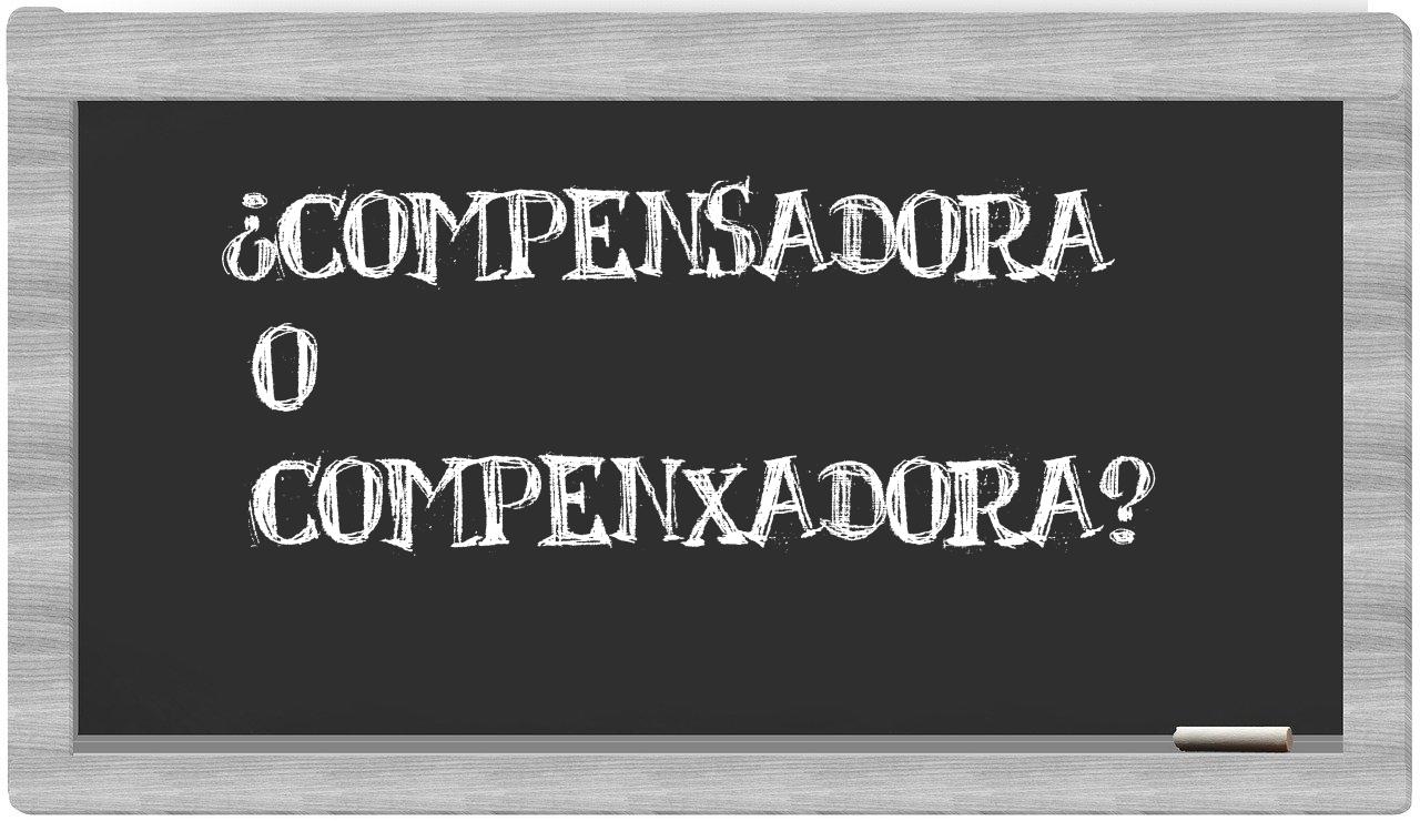 En la situación particular que compara los términos compensadora y compenxadora, no deberías vacilar, pues únicamente compensadora es la forma correcta de escribirlo; la palabra compenxadora no está registrada en el Diccionario de la Real Academia Española.