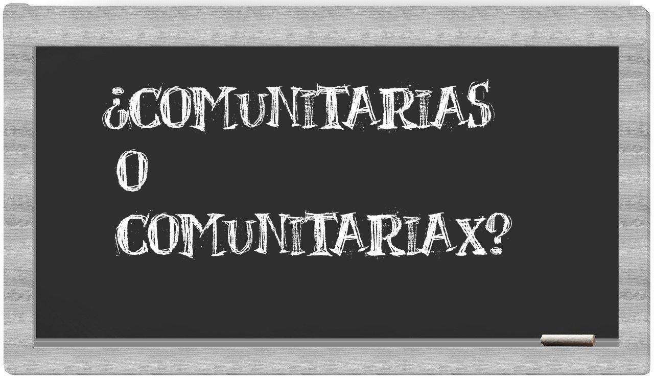Cuando se presenta la disyuntiva entre comunitarias y comunitariax, no hay lugar para la incertidumbre, porque únicamente comunitarias se encuentra correctamente redactada. Por otro lado, comunitariax es una palabra que no se halla registrada en el Diccionario de la Real Academia Española.