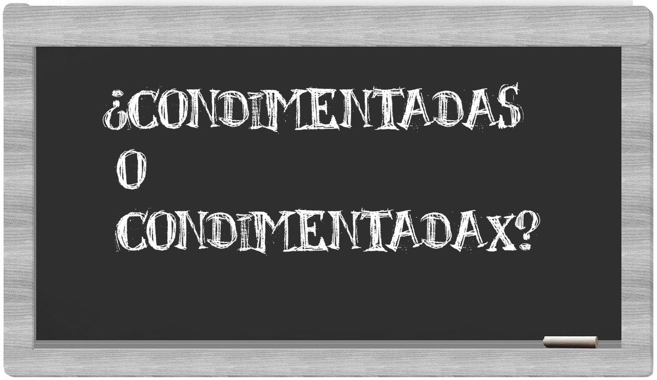 A la hora de elegir entre los términos condimentadas y condimentadax, es fundamental que no titubees; únicamente condimentadas se encuentra debidamente registrada y aceptada, mientras que condimentadax no forma parte del léxico oficial del Diccionario de la Real Academia Española.
