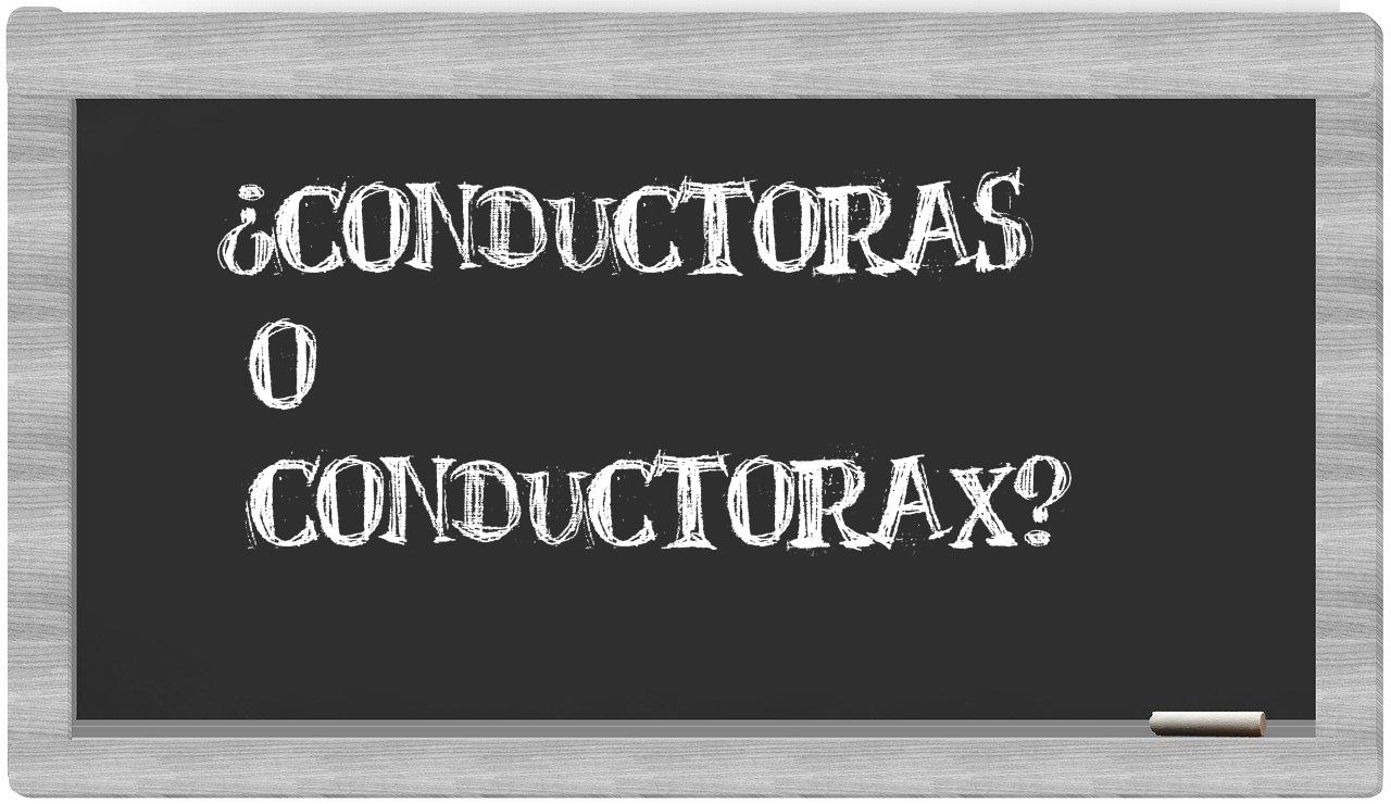 En la situación específica que involucra a conductoras y conductorax, no deberías titubear ni un instante, pues únicamente conductoras se encuentra correctamente redactada. Por otro lado, conductorax no figura en el Diccionario de la Real Academia Española.