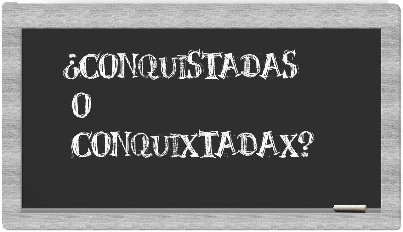 Cuando se trata de la distinción entre conquistadas y conquixtadax, no hay lugar para la incertidumbre, puesto que únicamente conquistadas se encuentra correctamente redactada. Por otro lado, conquixtadax no figura en el repertorio del Diccionario de la Real Academia Española.