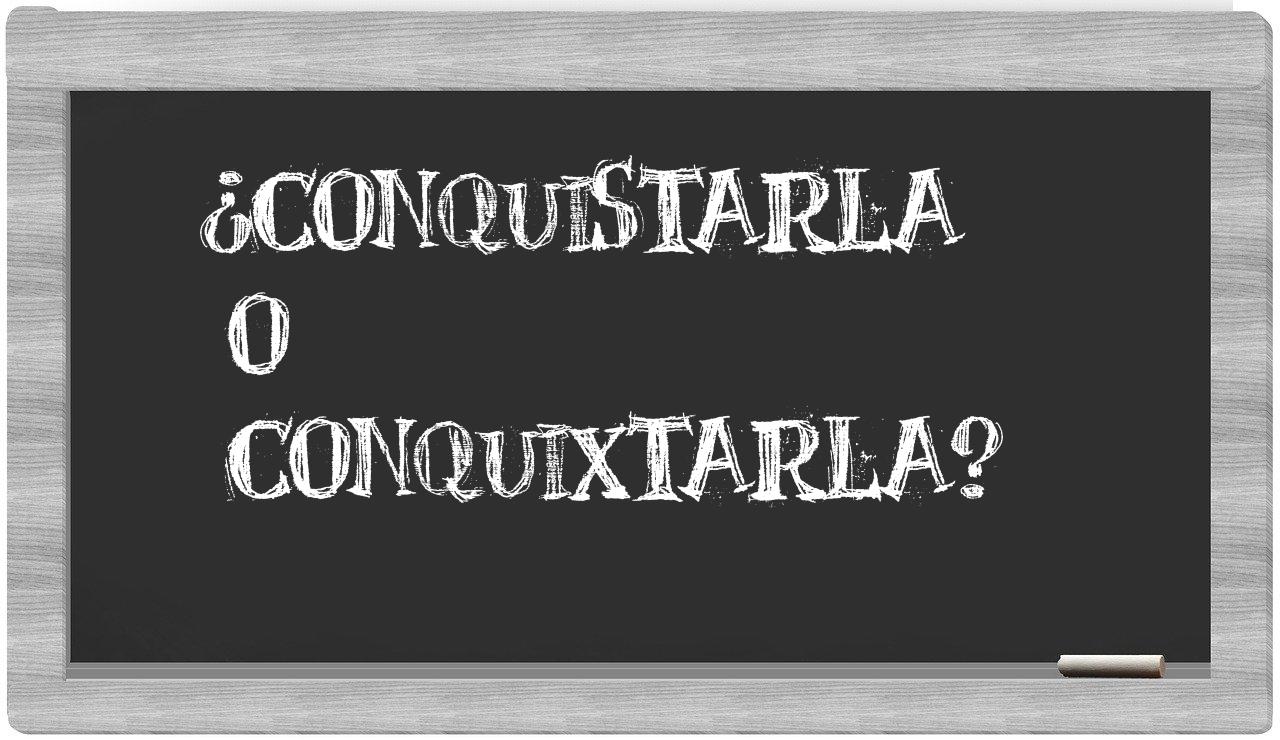 Cuando se presenta la disyuntiva entre conquistarla y conquixtarla, es fundamental que no vaciles, puesto que únicamente conquistarla está debidamente registrada como correcta. Por otro lado, conquixtarla no figura en el Diccionario de la Real Academia Española.