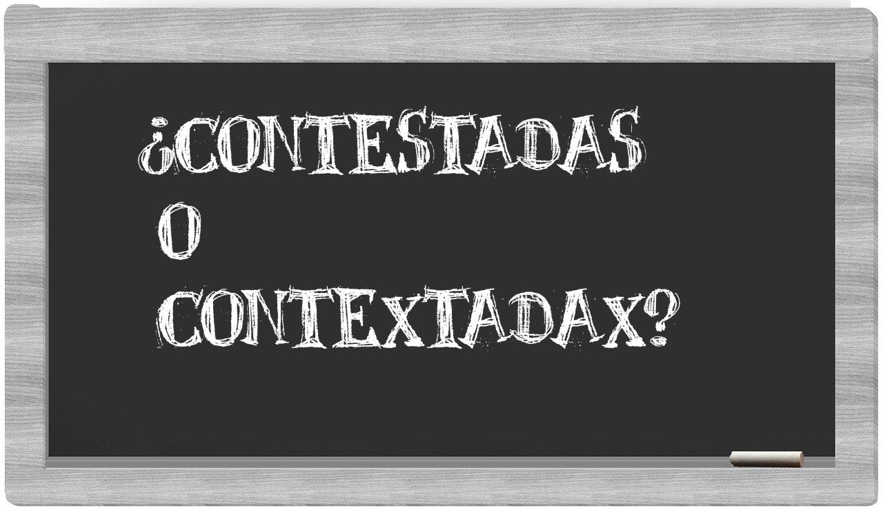 En la particular situación que se da entre los términos contestadas y contextadax, es fundamental que no titubees, porque únicamente contestadas es la forma adecuada. En cambio, contextadax carece de reconocimiento en el Diccionario de la Real Academia Española.