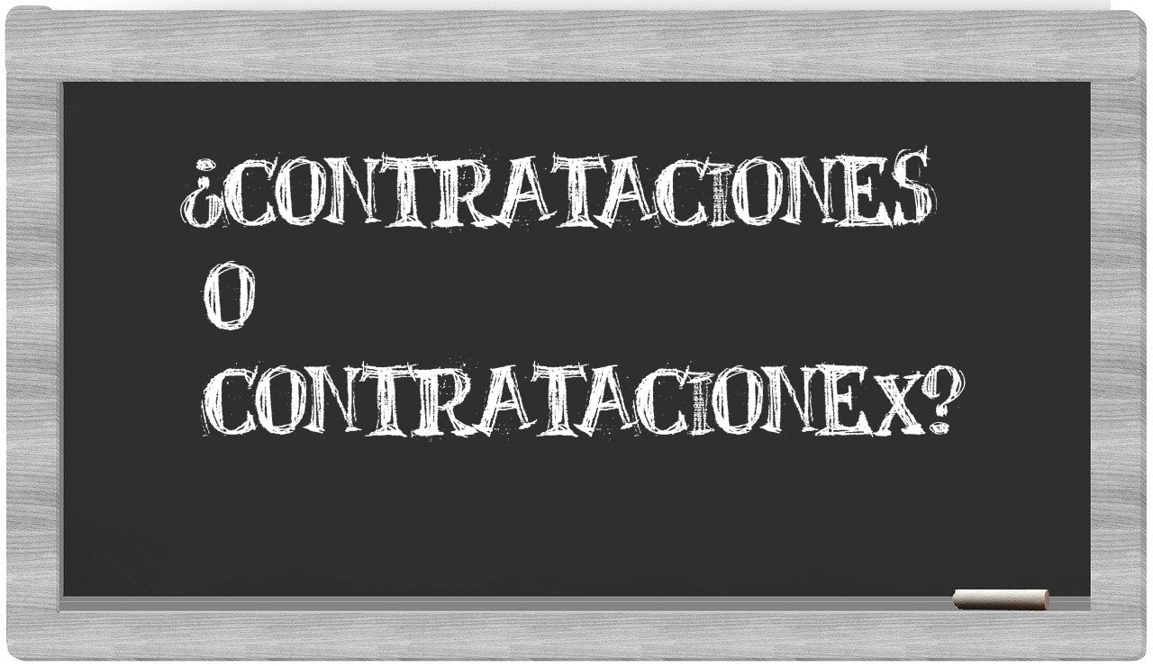 En la particularidad que rodea a las voces contrataciones y contratacionex, nunca deberías titubear, porque es únicamente contrataciones la que se presenta de manera adecuada. La forma contratacionex no figura en el Diccionario de la Real Academia Española.