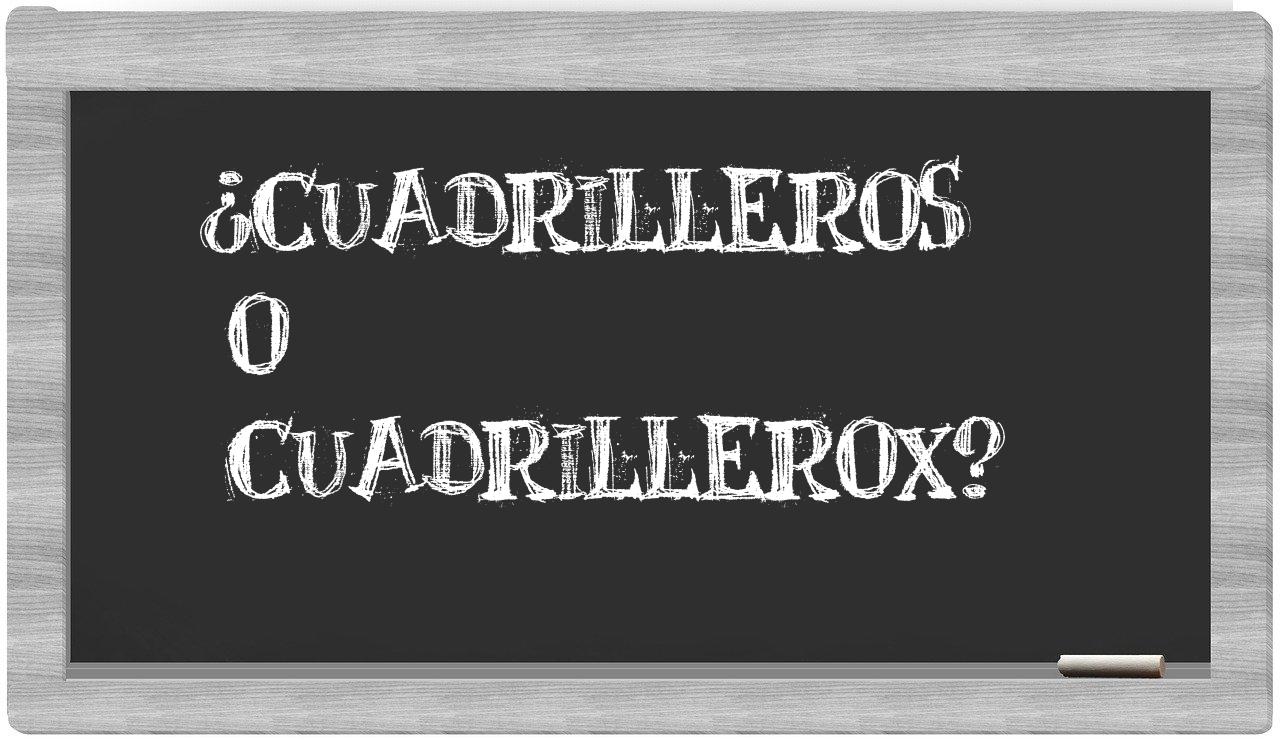 En la particular situación que involucra a cuadrilleros y cuadrillerox, no deberías vacilar en tu elección, puesto que únicamente cuadrilleros está correctamente formulada. Por su parte, cuadrillerox no está registrada en el prestigioso Diccionario de la Real Academia Española.