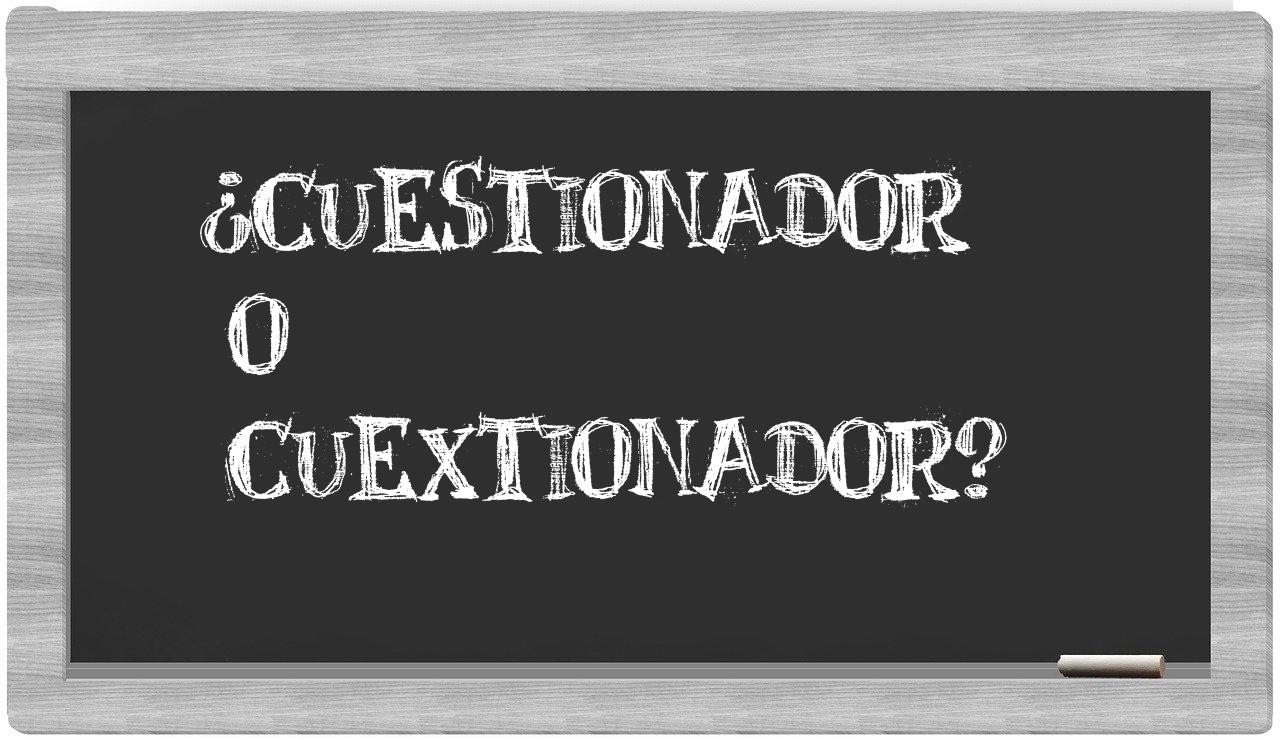 En la particularidad que involucra a cuestionador y cuextionador, nunca deberías tener titubeos, puesto que únicamente cuestionador se encuentra debidamente registrada en el léxico formal. Por otro lado, cuextionador no figura en el repertorio de la Real Academia Española.