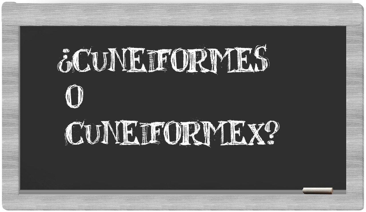 Cuando se presenta la disyuntiva entre cuneiformes y cuneiformex, es fundamental no vacilar, dado que únicamente cuneiformes es la que se encuentra adecuadamente redactada. Por su parte, cuneiformex no figura en el glosario de la Real Academia Española.