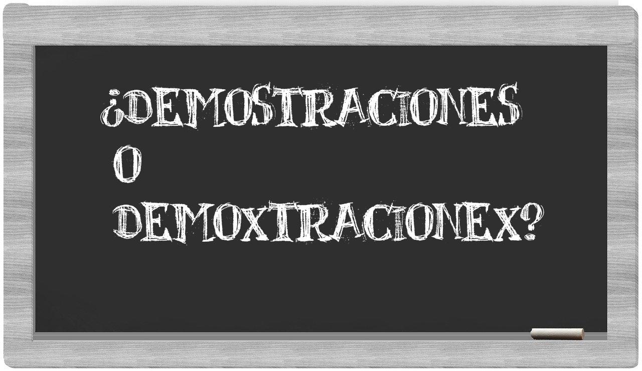 Cuando se trata de elegir entre las expresiones demostraciones y demoxtracionex, nunca deberías titubear, puesto que únicamente demostraciones es la que está adecuadamente redactada. Por otro lado, demoxtracionex no figura en el léxico oficial de la Real Academia Española.