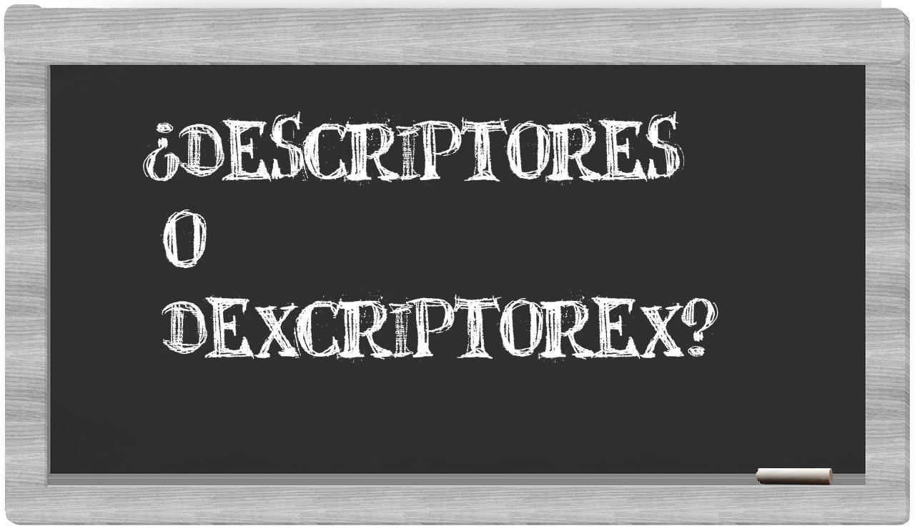 En la particularidad que rodea a las voces descriptores y dexcriptorex, nunca deberías titubear, porque es únicamente descriptores la que se presenta de manera adecuada. La forma dexcriptorex no figura en el Diccionario de la Real Academia Española.