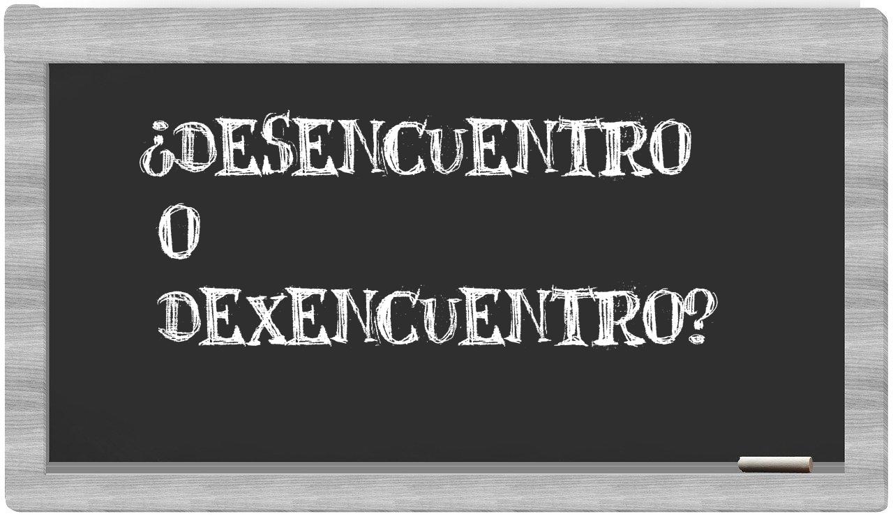 En la situación particular que involucra a desencuentro y dexencuentro, nunca deberías vacilar, puesto que únicamente desencuentro se encuentra adecuadamente redactada. En cambio, dexencuentro no figura en el léxico de la Real Academia Española.