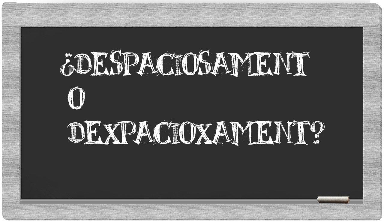 Cuando se trata de discernir entre despaciosament y dexpacioxament, es fundamental no titubear, puesto que únicamente despaciosament se presenta con la ortografía adecuada; por otro lado, dexpacioxament se encuentra ausente en el Diccionario de la Real Academia Española.