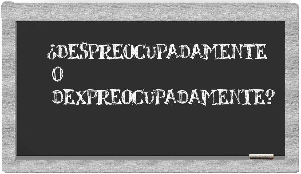 En la situación particular que involucra los términos despreocupadamente y dexpreocupadamente, no deberías titubear en tu elección, puesto que únicamente despreocupadamente se encuentra registrada de manera adecuada. Por otro lado, dexpreocupadamente no se halla en el reconocido Diccionario de la Real Academia Española.