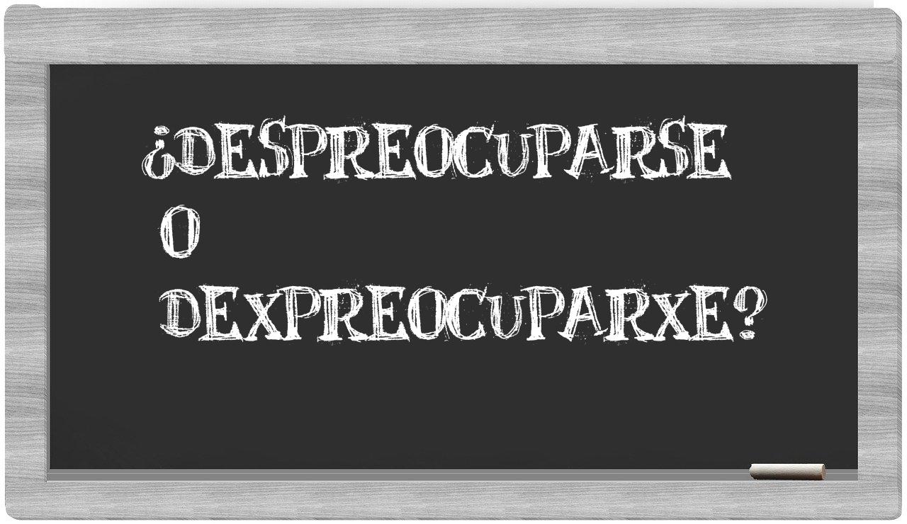 En la situación específica que involucra las palabras despreocuparse y dexpreocuparxe, nunca deberías tener incertidumbre, puesto que únicamente despreocuparse se encuentra debidamente registrada y validada. En contraste, dexpreocuparxe no figura en el Diccionario de la Real Academia Española.