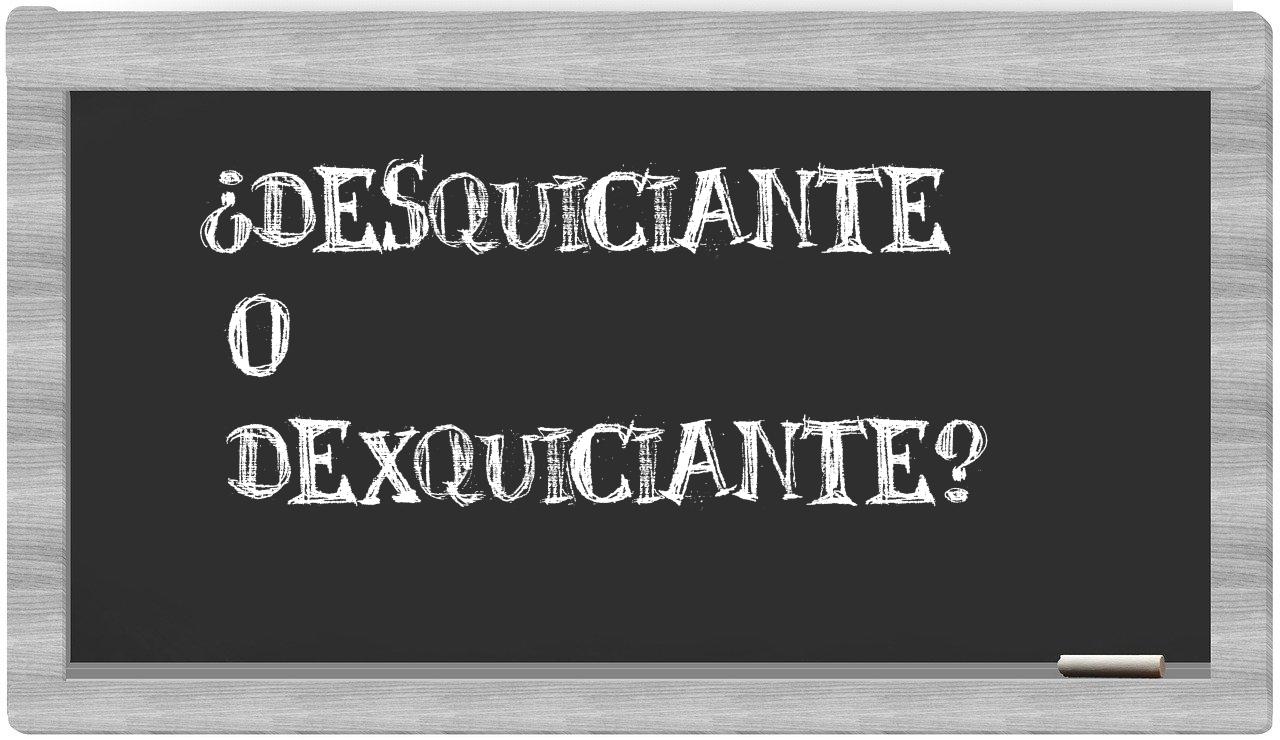 En la situación particular que involucra los términos desquiciante y dexquiciante, no deberías experimentar la más mínima incertidumbre, dado que únicamente desquiciante se presenta como la opción adecuada. Por otro lado, dexquiciante carece de reconocimiento en el Diccionario de la Real Academia de la Lengua.