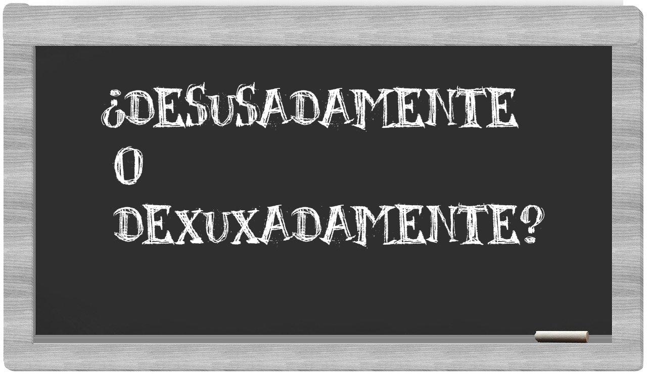 En la particular relación entre los términos desusadamente y dexuxadamente, la elección debe ser evidente, porque únicamente desusadamente se encuentra debidamente registrada en el léxico oficial. Por otro lado, dexuxadamente no forma parte del repertorio de la Real Academia de la Lengua.