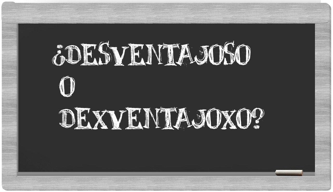 Cuando se presenta la elección entre desventajoso y dexventajoxo, no hay lugar a la indecisión, pues únicamente desventajoso es la opción correcta, mientras que dexventajoxo carece de existencia en el diccionario de la Real Academia Española.