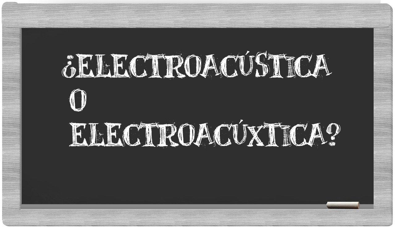 Cuando se trata de discernir entre electroacústica y electroacúxtica, es fundamental no titubear, puesto que únicamente electroacústica se presenta con la ortografía adecuada; por otro lado, electroacúxtica se encuentra ausente en el Diccionario de la Real Academia Española.