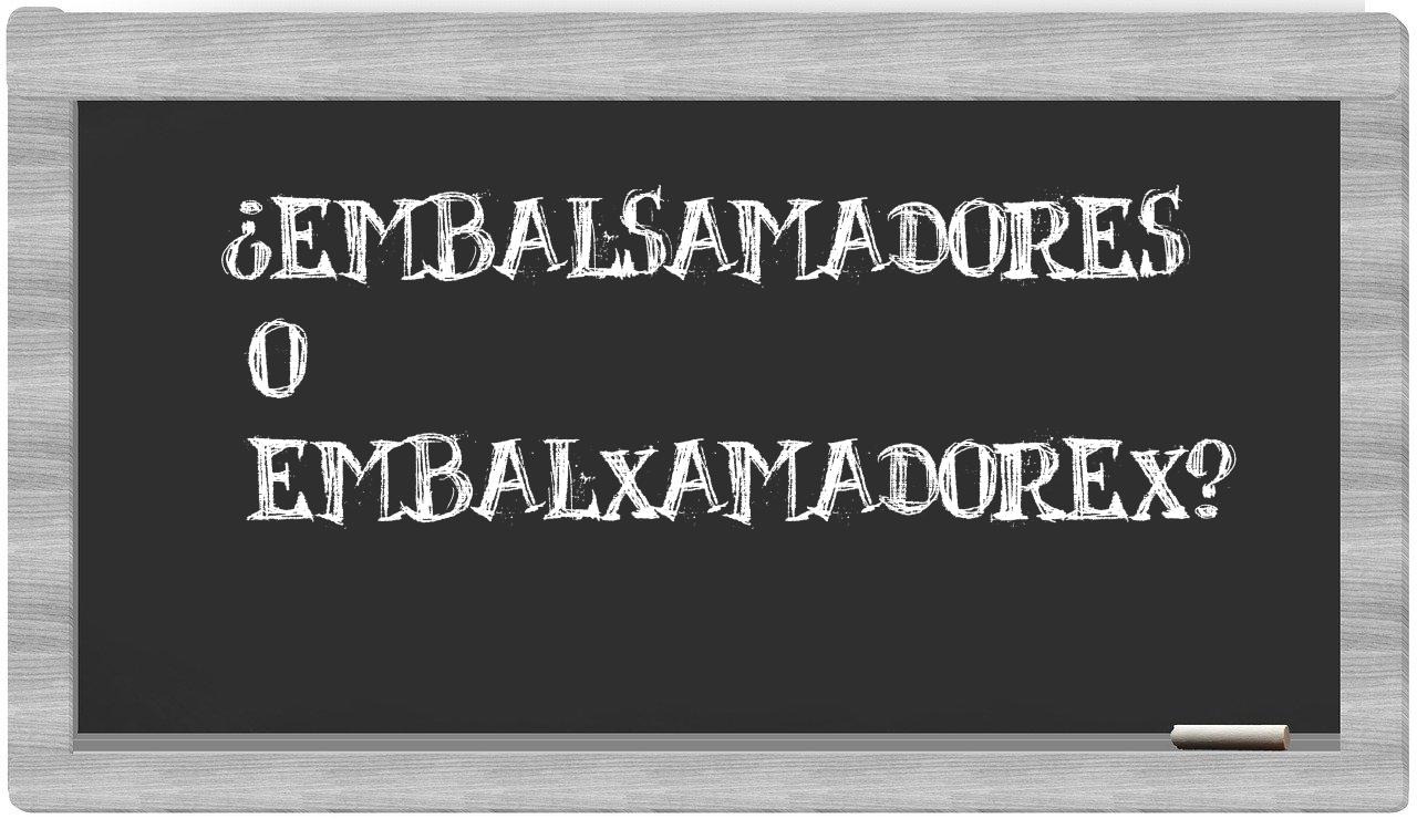 Cuando se presenta la elección entre embalsamadores y embalxamadorex, es fundamental que no tengas ambivalencias, puesto que únicamente embalsamadores representa la forma adecuada. Por otro lado, embalxamadorex carece de reconocimiento en el Diccionario de la Real Academia Española.