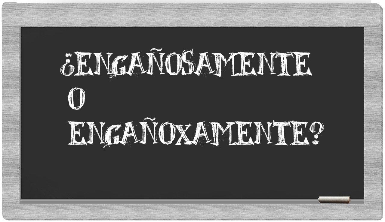 Cuando se presenta la elección entre engañosamente y engañoxamente, no hay lugar a la indecisión, pues únicamente engañosamente es la opción correcta, mientras que engañoxamente carece de existencia en el diccionario de la Real Academia Española.