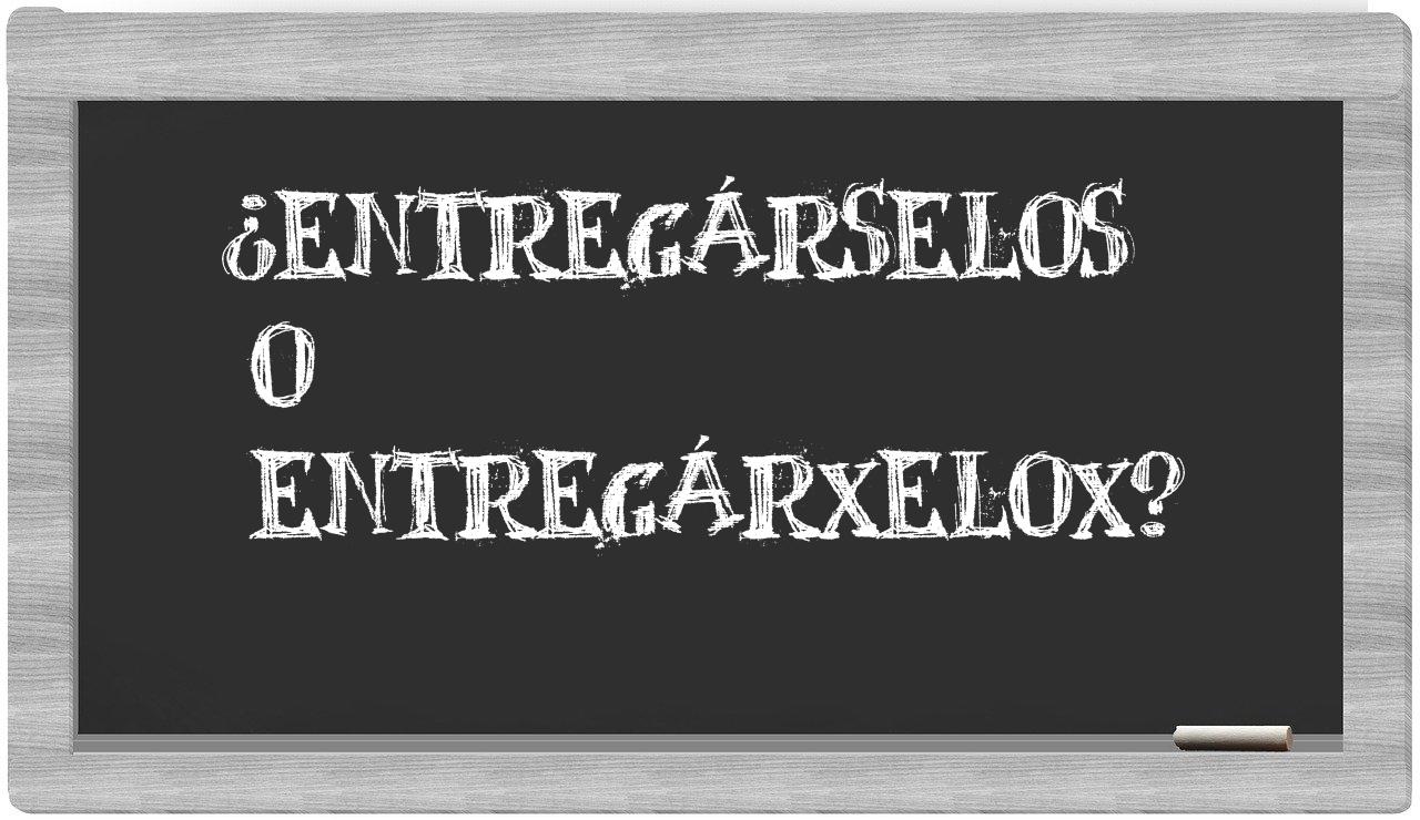 Cuando se trata de la combinación entre el término entregárselos y el vocablo entregárxelox, es fundamental que no experimentes vacilaciones, porque exclusivamente entregárselos es la forma adecuada. Por otro lado, entregárxelox no se encuentra en el repertorio de la Real Academia Española.