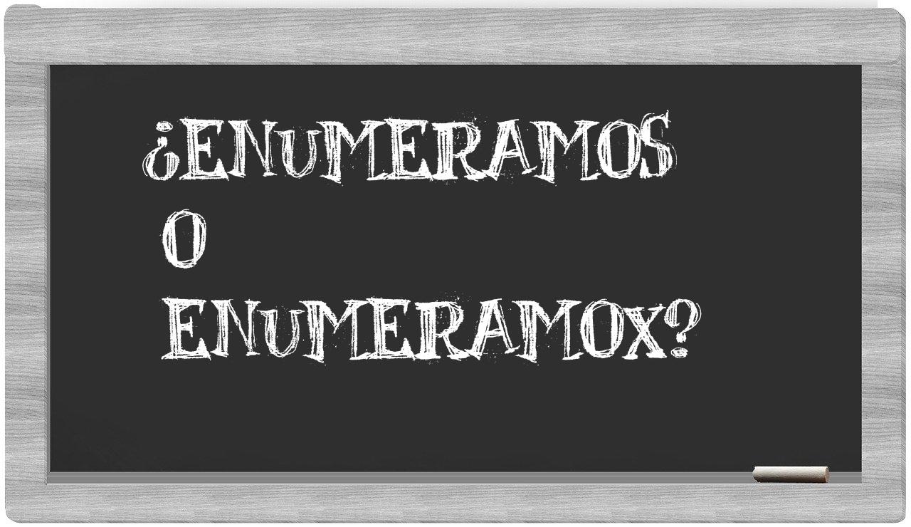 En la situación particular que involucra los términos enumeramos y enumeramox, no deberías experimentar la más mínima incertidumbre, dado que únicamente enumeramos se presenta como la opción adecuada. Por otro lado, enumeramox carece de reconocimiento en el Diccionario de la Real Academia de la Lengua.