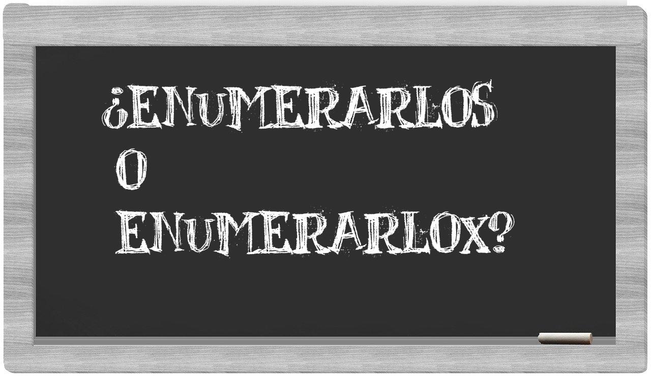 Cuando se trata de distinguir entre enumerarlos y enumerarlox, no deberías titubear en tu elección, puesto que únicamente enumerarlos es la forma correcta y aceptada; de hecho, enumerarlox no se encuentra en el repertorio del Diccionario de la Real Academia Española.