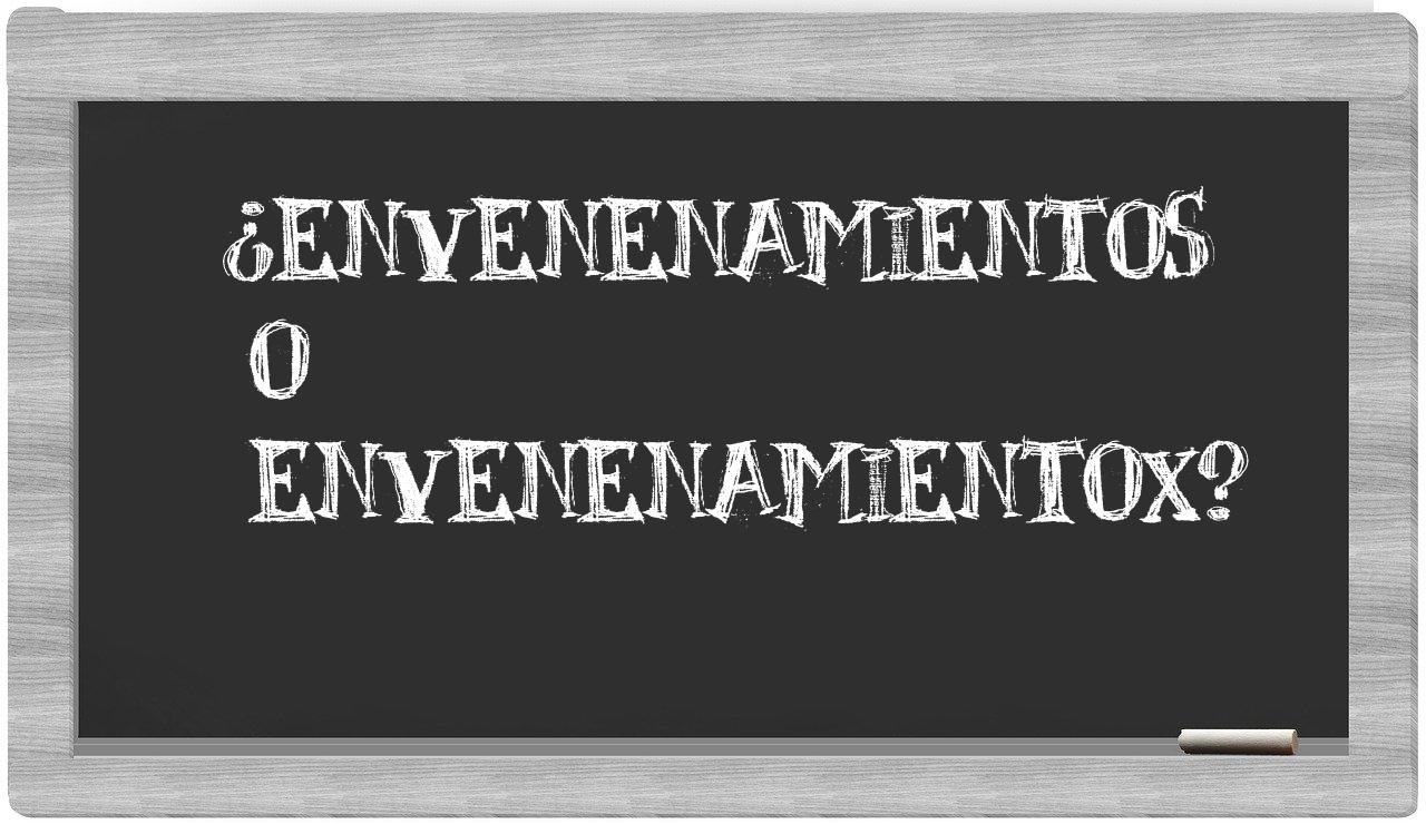 En la particular circunstancia que se presenta entre los términos envenenamientos y envenenamientox, nunca deberías titubear, puesto que únicamente envenenamientos se encuentra correctamente redactado. Por otro lado, envenenamientox no se halla en el léxico de la Real Academia Española.