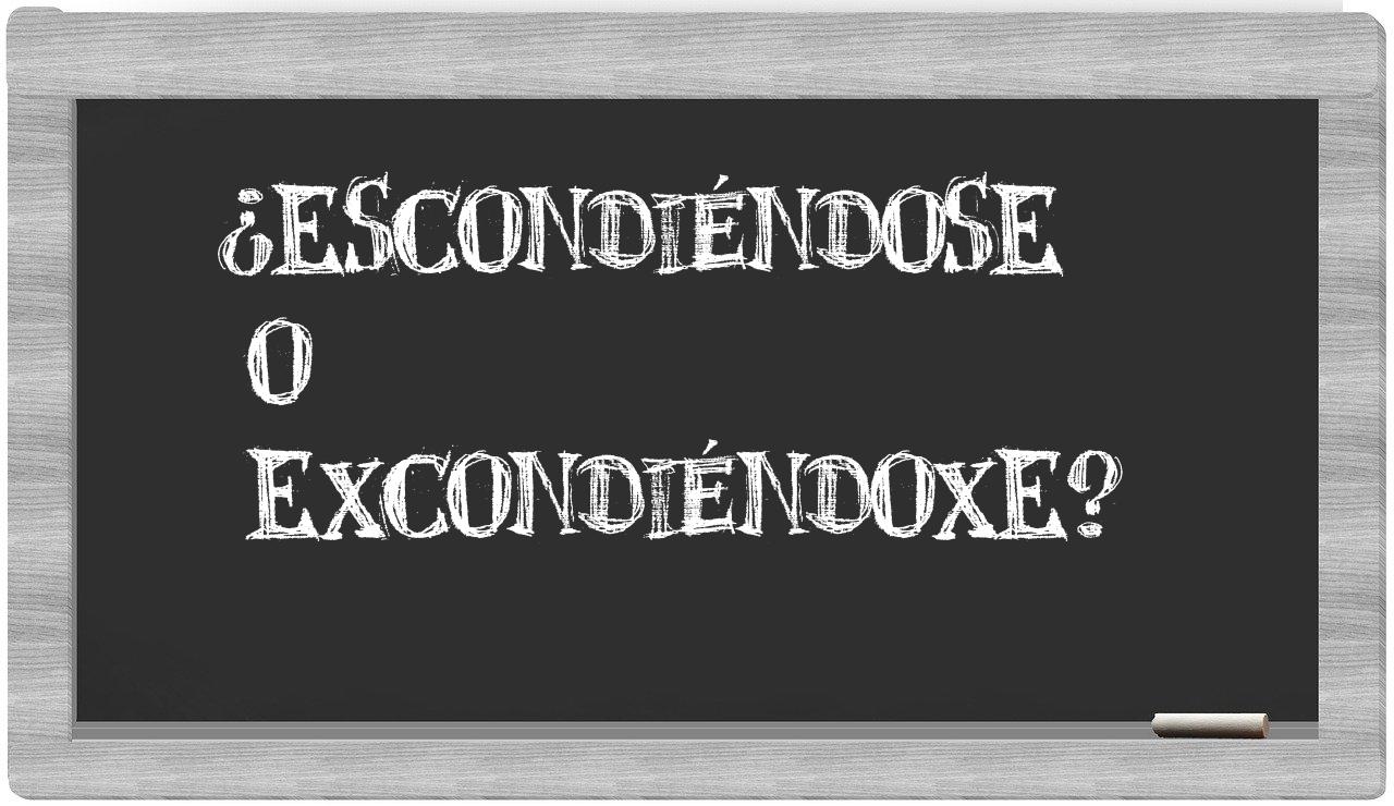 Cuando se confrontan los términos escondiéndose y excondiéndoxe, es fundamental no titubear, puesto que solo escondiéndose es la opción adecuada y correcta; por otro lado, excondiéndoxe carece de presencia en el Diccionario de la Real Academia Española.
