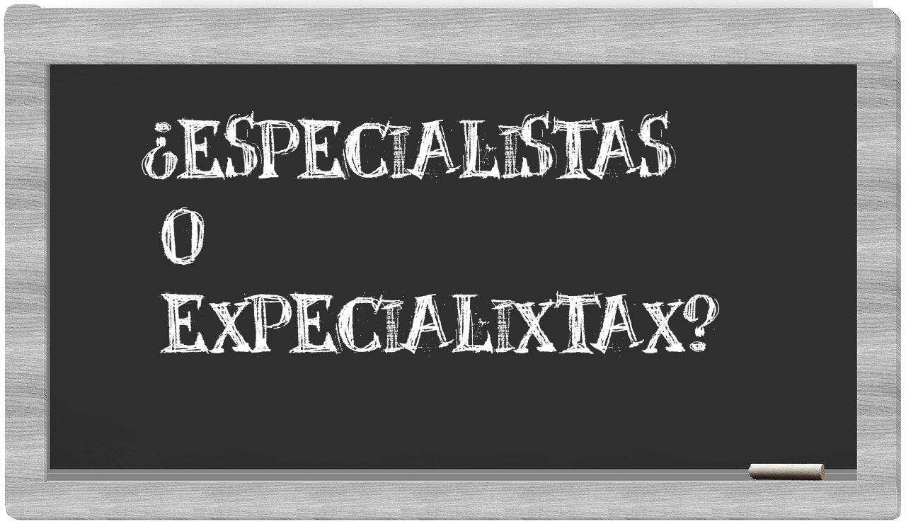 Cuando se presenta la elección entre especialistas y expecialixtax, la decisión debe ser clara y sin titubeos, puesto que únicamente especialistas es la forma adecuada. Por otro lado, expecialixtax no figura en el Diccionario de la Real Academia Española.