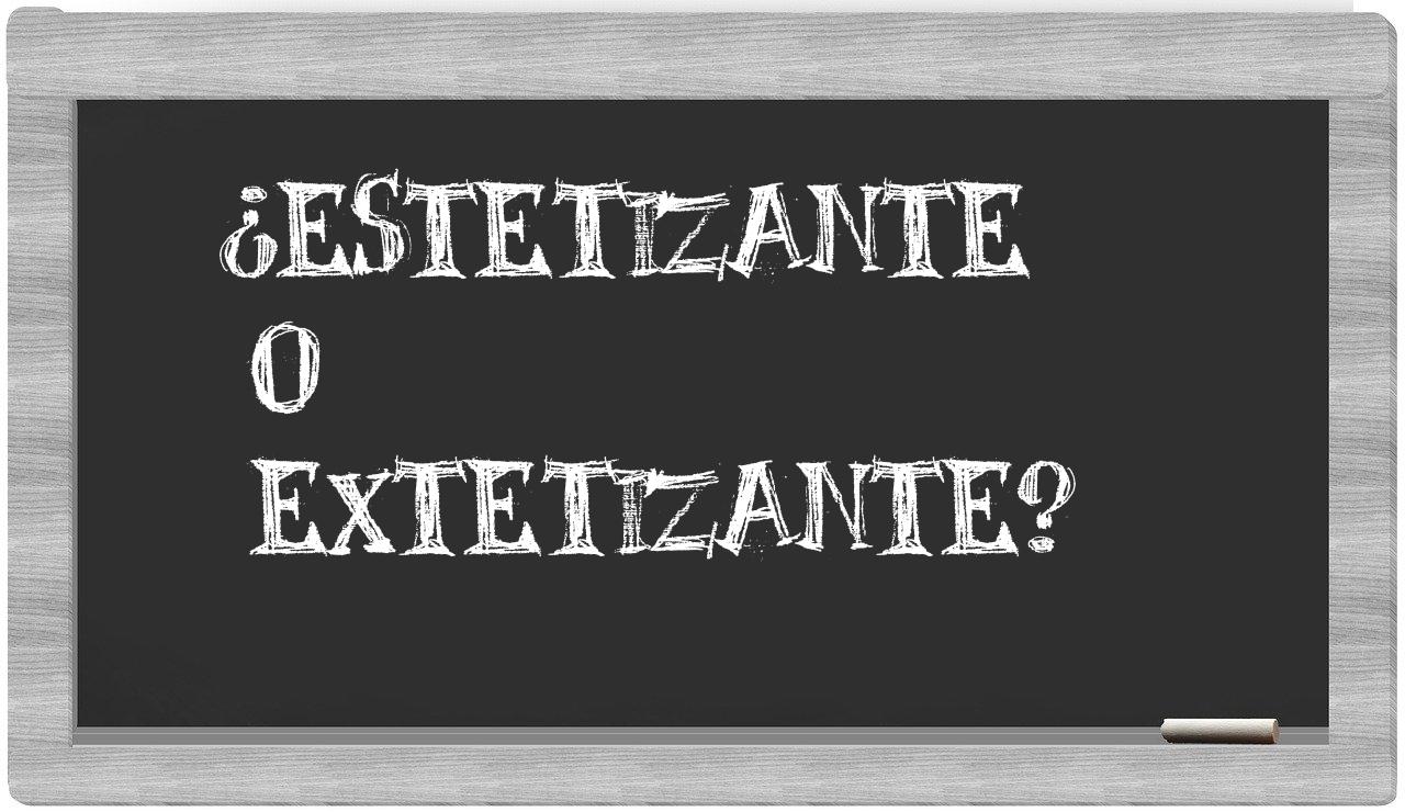 Cuando te enfrentes a la elección entre estetizante y extetizante, es fundamental que tengas confianza, puesto que únicamente estetizante es la forma adecuada. Recuerda que extetizante no se encuentra registrada en el Diccionario de la Real Academia Española.