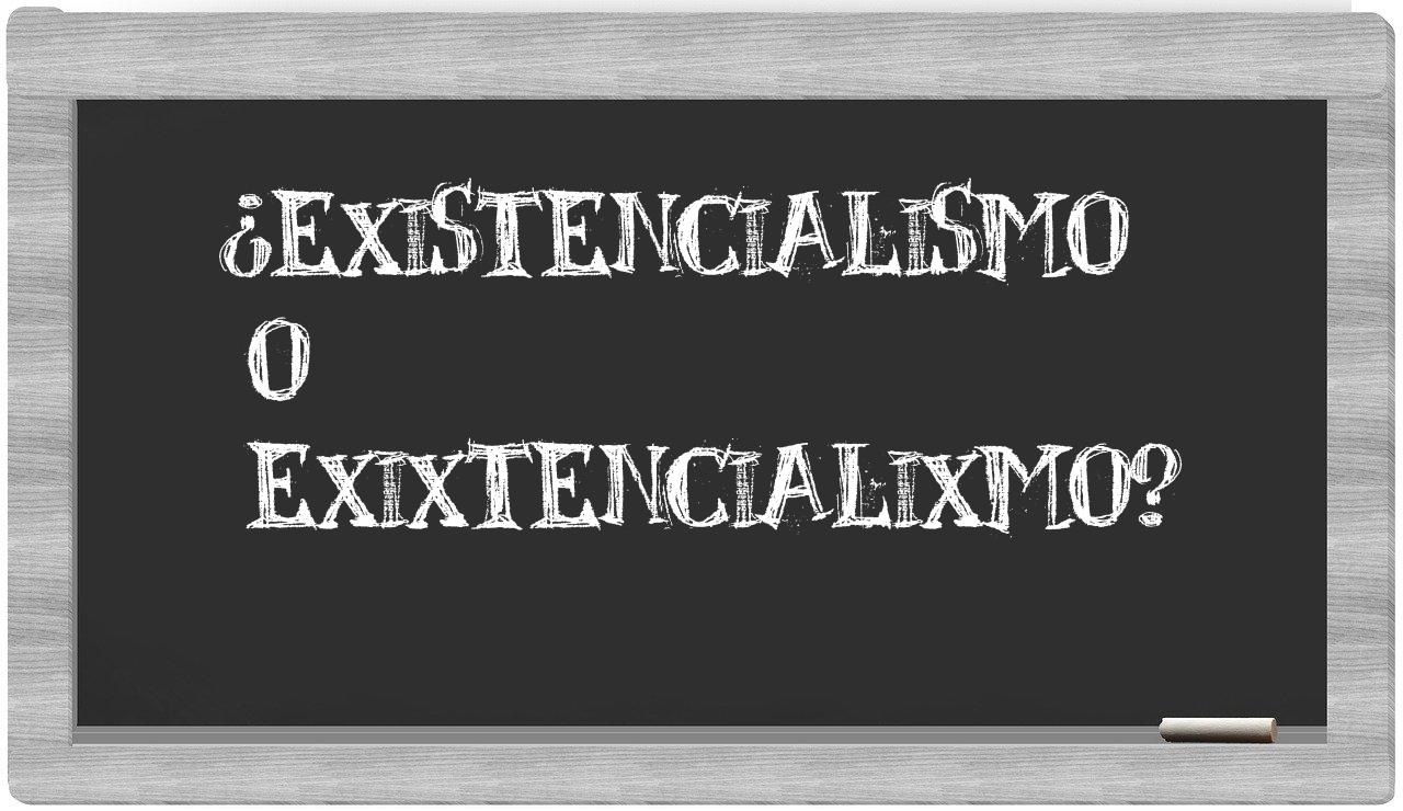 Cuando se presenta la disyuntiva entre existencialismo y exixtencialixmo, no hay lugar para la incertidumbre, porque únicamente existencialismo se encuentra correctamente redactada. Por otro lado, exixtencialixmo es una palabra que no se halla registrada en el Diccionario de la Real Academia Española.