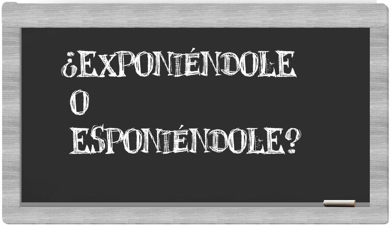 Cuando se presenta la disyuntiva entre exponiéndole y esponiéndole, no hay lugar para la incertidumbre, porque únicamente exponiéndole se encuentra correctamente redactada. Por otro lado, esponiéndole es una palabra que no se halla registrada en el Diccionario de la Real Academia Española.