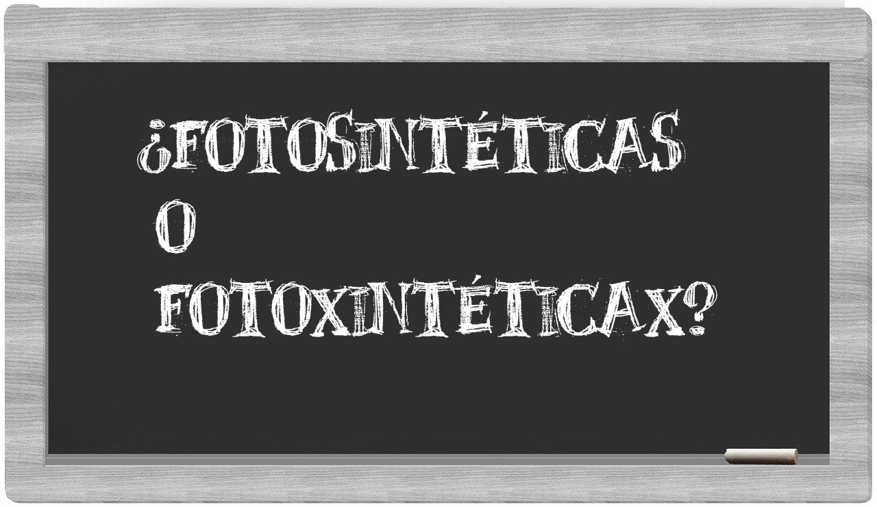No deberías titubear cuando se trata de distinguir entre fotosintéticas y fotoxintéticax, porque únicamente fotosintéticas está correctamente redactada; cabe mencionar que fotoxintéticax no se encuentra registrada en el Diccionario de la Real Academia Española.
