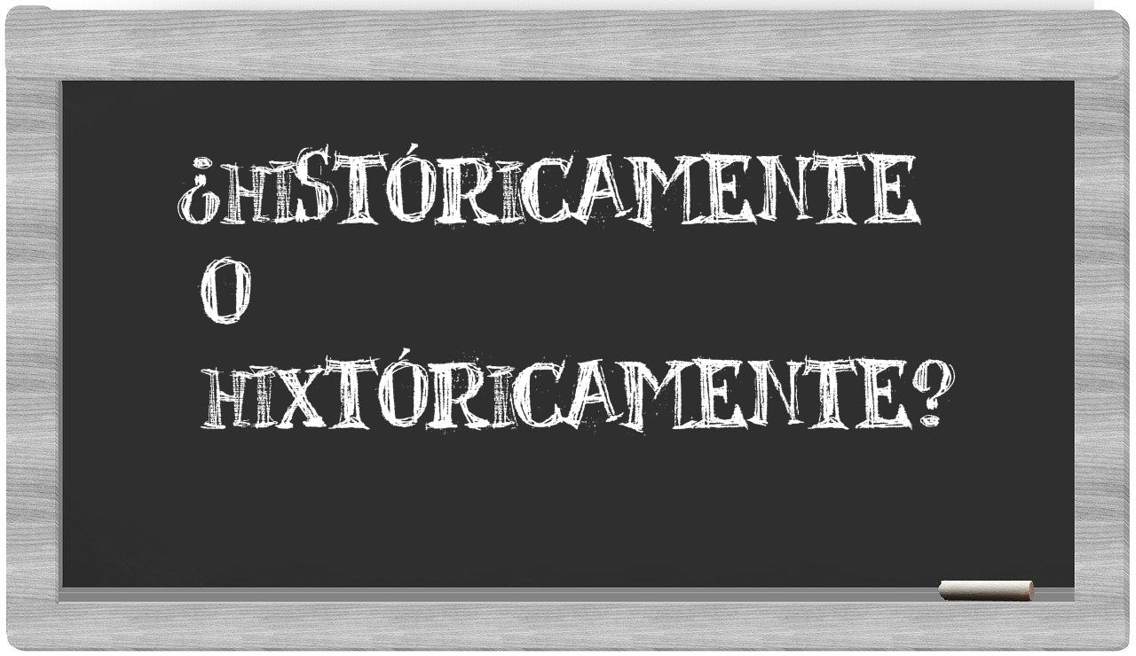Cuando se trata de las palabras históricamente y hixtóricamente, nunca deberías tener vacilaciones, dado que únicamente históricamente está correctamente redactada. Cabe mencionar que hixtóricamente no se encuentra en el diccionario oficial de la Real Academia Española.