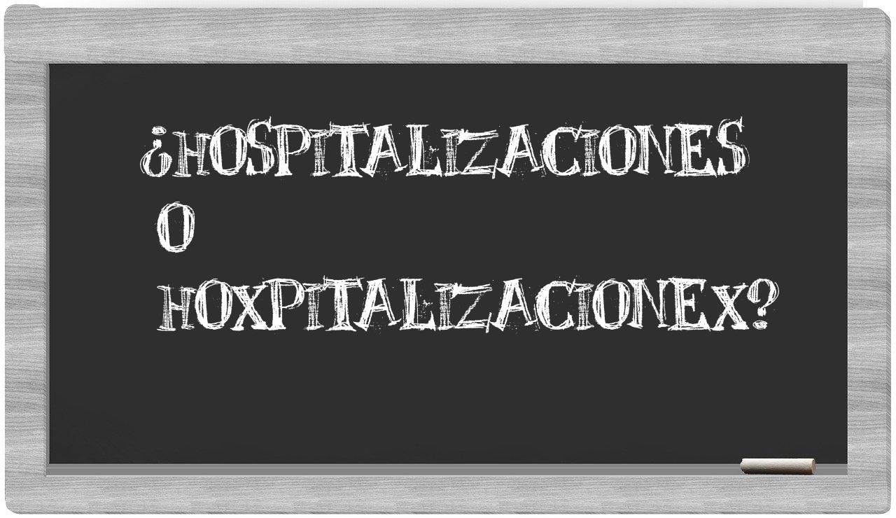 Cuando se presenta la disyuntiva entre hospitalizaciones y hoxpitalizacionex, no hay lugar para la incertidumbre, porque únicamente hospitalizaciones se encuentra correctamente redactada. Por otro lado, hoxpitalizacionex es una palabra que no se halla registrada en el Diccionario de la Real Academia Española.