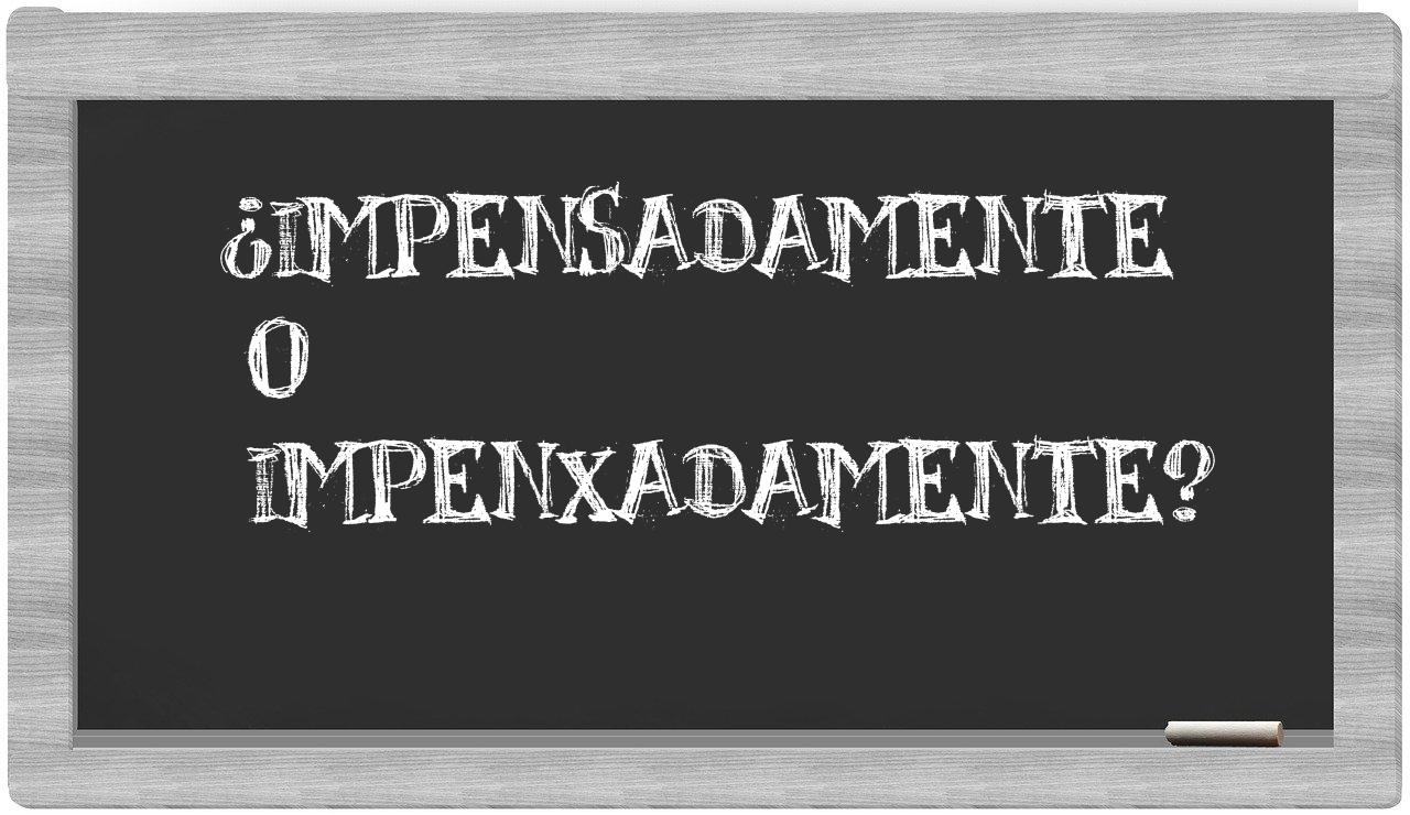En la situación particular que involucra los términos impensadamente y impenxadamente, es fundamental que no vaciles, puesto que únicamente impensadamente está registrado de manera adecuada. Por otro lado, impenxadamente carece de reconocimiento en el Diccionario de la Real Academia Española.